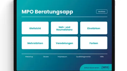 Die Beratungs-App von MPO ermöglicht die anschauliche Darstellung von Brillengläsern in 3D – inklusive verschiedener Glasdicken, Veredelungen und Farbvarianten. Als kostenfreies Tool kann die App zur Präsentation des Brillenglasangebots im Verkaufsgespräch eingebunden werden. Großflächige, hochauflösende Visualisierungen veranschaulichen Produktvorteile und machen Unterschiede erkennbar. Der strukturierte Aufbau soll eine zügige Navigation durch das umfassende Produktportfolio erlauben – von Einstärken- über Gleitsicht- bis hin zu Nah- und Raumdistanz- und Sonnenbrillengläsern. Die Produkte werden dabei präzise und realitätsnah dargestellt. Ergänzend lassen sich moderne Veredelungen, etwa Hightech-Beschichtungen, gezielt in die Produkt-Präsentation integrieren.