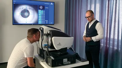 Letztere, also die Scanner, sind ein zentraler Bestandteil der biometrischen Reise Rodenstocks. Um diese zu starten, geht es zunächst ins Nachbargebäude. Dort wartet im ersten Geschoss bereits Libor Pivoňka. Auf dem Weg in den großen Meetingraum fallen sofort die mit den Big Vision Visuals gebrandeten Wände auf. Pivoňka ist Product Manager für Tschechien und die Slowakei und schon seit 18 Jahren im Unterneh men. Auf einem Tisch am Ende des Raumes sind zwei DNEye Scanner aufgebaut, die zweite Generation, die alle notwendigen und wichtigen Informationen für die Vermessung der biometrischen Daten liefert, und der erst vor wenigen Monaten gelaunchte DNEye Scanner 3, der zusätzlich unter anderem eine integrierte Funduskamera besitzt und eine Tränenfilm analyse ermöglicht.