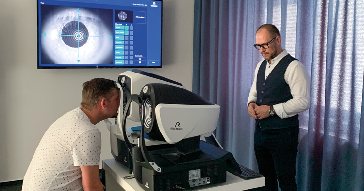 Mit dem DNEye-Scanner werden die biometrischen Daten des Auges erfasst. Später fließen 90 Parameter in die Berechnung der Big-Vision-Gläser ein. Libor Pivoňka (r.) nimmt die Messung bei DOZ-Chefredakteur David Friederichs vor.
