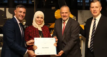(l-r) Neil Retallic, Leiter der beruflichen Entwicklung bei Specsavers, Professor May Bakkar, Preisträgerin 2023, Dr. Juan Carlos Aragón, ehemaliger Präsident von CooperVision Specialty EyeCare, und Professor Philip Morgan, Präsident der IACLE, bei der Verleihung der IACLE-Preise 2023 während des 4. Weltkongresses in Birmingham, UK.