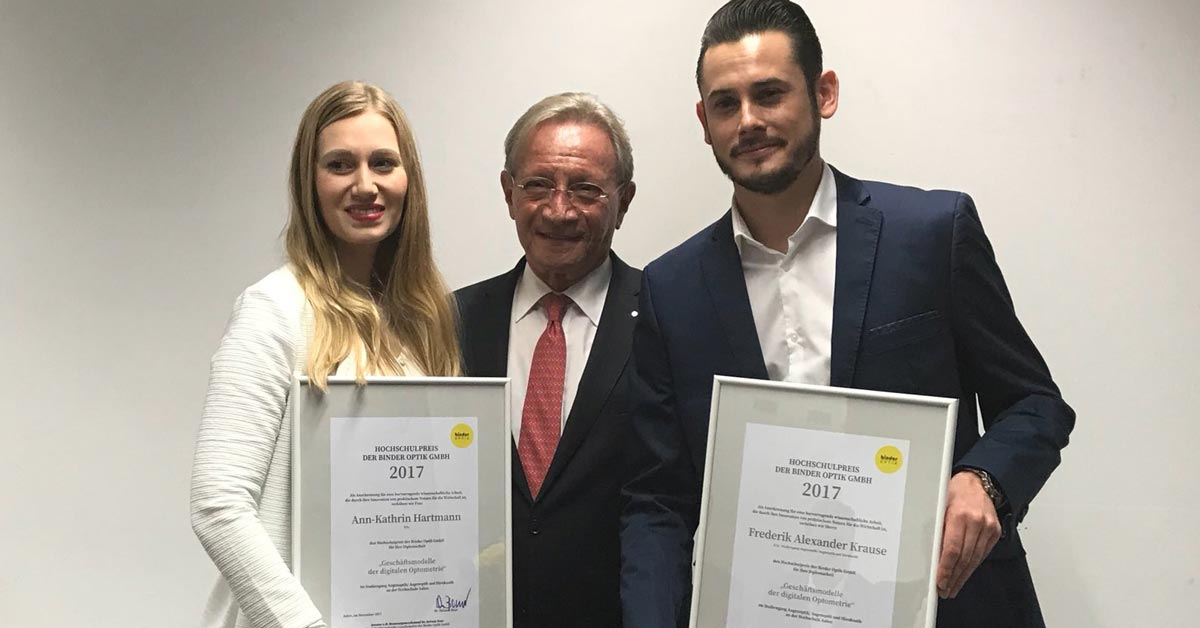 Für ihre Abschlussarbeit wurden die Studenten Ann-Kathrin Hartmann und Frederik Alexander Krause der Hochschule Aalen mit dem Binder-Preis geehrt. „Durch die technischen Innovationen und den fortschreitenden Trend der Digitalisierung, welcher sich in allen Branchen auf unterschiedliche Weise bemerkbar macht, wird es Zeit, auch im augenoptischen und optometrischen Sektor umzudenken und zu handeln“, erklärte Krause den Ansatz ihrer Bachelorarbeit, die den Titel „Geschäftsmodelle der digitalen Optometrie“ trägt.