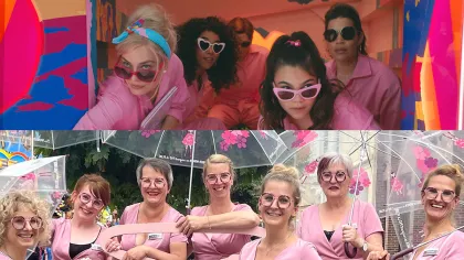 Brillis oder Barbies? In diesem Fall haben sich oben die „Puppen“ um ihre Hauptdarstellerin Margot Robbie (links) versammelt, unten die Augenoptikerinnen um ihre Hauptdarstellerin Katrin Brüch (rechts). Würde Barbie jemals 46 Jahre alt werden, könnte man möglicherweise eine gewisse Ähnlichkeit feststellen.