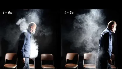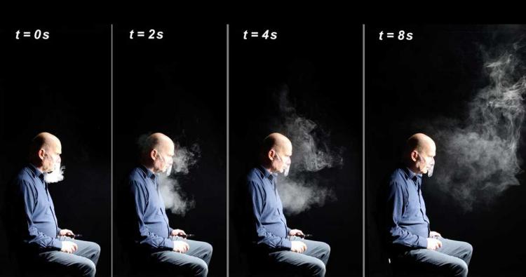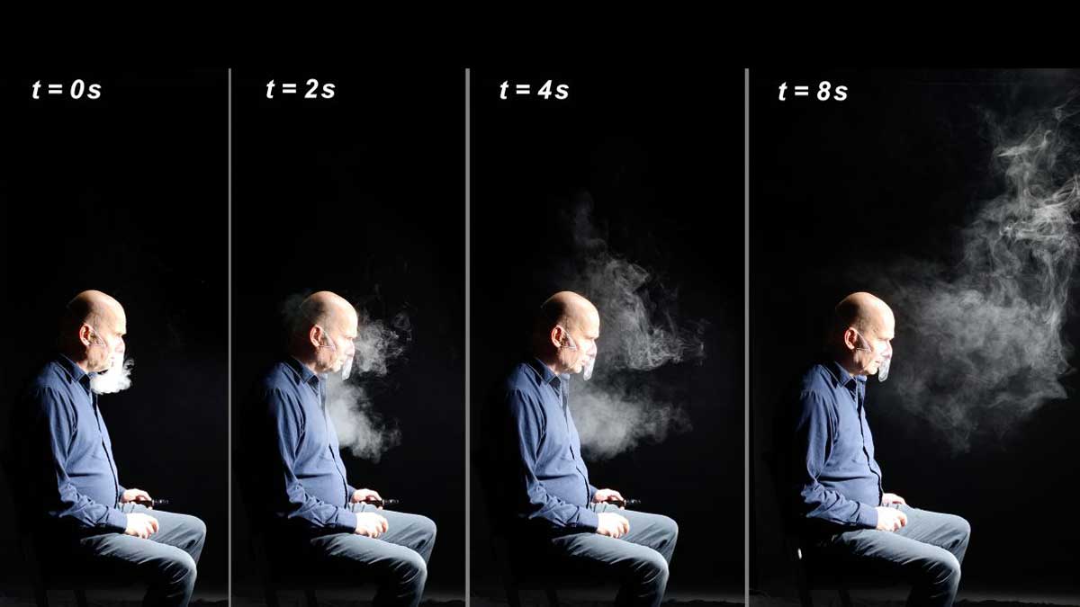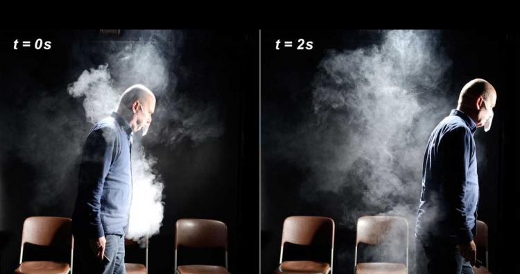 In einem ersten Test (Abb. 1) sitzt die Versuchsperson auf einem Stuhl und atmet gleichmäßig durch die Nase aus, ohne sich zu bewegen oder zu sprechen. Das Ergebnis: „Zunächst strömt das Aerosol entlang des Körpers nach unten, wie es auch vom Hersteller beworben wird. Kurz darauf wird das Aerosol nach vorne umgelenkt und dehnt sich dann weit in den Bereich vor der Versuchsperson aus. Eine direkt gegenübersitzende Person wäre dadurch dem ausgeatmeten Aerosol direkt ausgesetzt“, heißt es in der Mitteilung der Institution. Deutlich zu erkennen sei auch, dass die flüssigen Partikel während der Ausbreitung zunehmend nach oben steigen, was durch den normalen Temperaturunterschied zwischen ausgeatmeter Luft und Raumluft begünstigt werden.