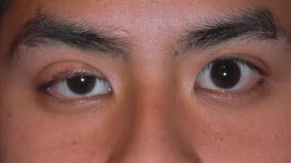 (rechts): Patient mit einer viralen Konjunktivitis am rechten Auge.