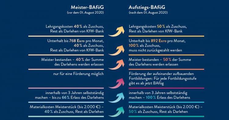 Wesentliche Änderungen finden sich bei der Förderung: Diese wird (wie bisher) zum Teil als Zuschuss (nicht zurückzuzahlen) gewährt und zum anderen Teil als zinsgünstiges Darlehen über die KfW-Bank. Für die Prüfungs- und Lehrgangsgebühren (die unabhängig von Einkommen und Vermögen anfallen) erhöht sich der Zuschuss von 40 auf 50 Prozent. Bei bestandener Meisterprüfung wird die Hälfte des KfW-Darlehens erlassen.