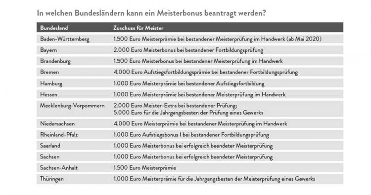 Je nach Bundesland kann eine Meisterprämie, ein Meisterbonus, eine Aufstiegsprämie oder ein Meister-Extra beantragt werden. Diese Prämien sollen die angehenden Meister unterstützen. Hannah ist in dieser Hinsicht enttäuscht: „Nordrhein-Westfalen ist eines der wenigen Bundesländer, das keine Meisterprämie anbietet.“ Zwischen 1.000 und 4.000 Euro gibt es auf Antrag in den anderen Bundesländern. Der Zentralverband des Deutschen Handwerks sowie einige Landesregierungen bemühen sich um eine bundeseinheitliche Lösung. Ob und wann diese kommt, ist jedoch unklar. Ebenso kann in manchen Bundesländern eine Meistergründungsprämie beantragt werden. Diese richtet sich an Handwerker, die nach ihrem Meister einen eigenen Betrieb gründen oder übernehmen.