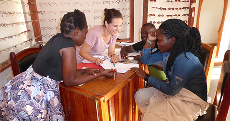 Eine der ehrenamtlichen Augenoptikerinnen unterrichtet die Frauen und Männer vor Ort, um ihnen das Wissen für ein eigenständiges Arbeiten zu geben. Dadurch können diese, wiederum den anderen Menschen helfen und diese versorgen.
