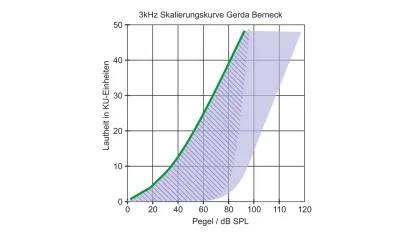Um den Verstärkungsbedarf bei diesem kombinierten Hörverlust besser abschätzen zu können, führt Hörakustiker Kolbe eine Hörfeldskalierung mit Schmalbandrauschen durch. Diese bestätigt das Vorhandensein einer Schallleitungskomponente in vollem Umfang. Betrachtet man die Skalierungskurve, so wird klar, dass die Kundin – im Gegensatz zu einer reinen Schallempfindungsschwerhörigkeit mit Rekruitment – auch bei hohen Eingangspegeln einen deutlichen Verstärkungsbedarf besitzt. Würde man ihren Hörverlust wie eine typische SES anpassen, ergäbe sich ein erhebliches Verstärkungsdefizit bei hohen Pegeln, die anderen Verstärkungseinstellungen wären ebenfalls  nicht optimal.