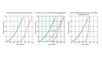 Abb. 3: Skalierungskurve von Gerda Berneck am Beispiel des rechten Ohrs 3 kHz. Links die vom Hörakustiker bestimmte Messkurve, in der Mitte die „Aufspaltung“ in SLS und SES. Rechts ein Vergleich mit einer Messkurve bei einem reinen SES mit gleicher Hörschwelle.