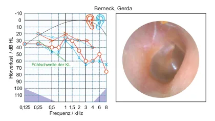 Abb. 1: Tonaudiogramm und Otoskopiebefund von Gerda Berneck. Durch die Darstellung des Tonaudiogramms beider Ohren in einem gemeinsamen Diagramm kann man leicht prüfen, ob bei der Messung ein Überhören aufgetreten ist oder die Fühlschwelle bei der Knochenleitungsmessung eingetreten ist.