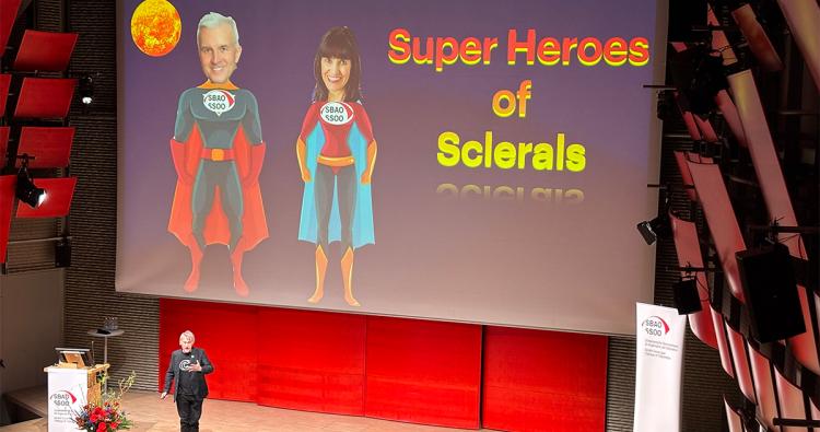 Direkt im Anschluss an die Generalversammlung am Sonntag startete die Fachtagung, in deren Rahmen der Credit-Point-Champion 2024 bekannt gegeben wurde. Denise Sigron gewann mit 150 gesammelten Credit-Points und erhielt auf der Bühne eine Urkunde für ihre Leistung. Die beiden Studentinnen Larissa Paulasto und Céline Carré durften zudem ihre Bachelorarbeit mit dem Titel „The Influence of High Aspherical Lenslets on Choroidal Thickness and Axial Length“ präsentieren. Da die Arbeit auf Englisch verfasst wurde, hielten die beiden auch ihre Präsentation in englischer Sprache. Ebenfalls auf Englisch referierte Brian Tompkins, der über das Thema „Superheroes of Scleral“ sprach. Mit lauter Musik, Videos und humorvollen Einlagen zog er das Publikum in seinen Bann und verwandelte seinen Vortrag in eine Show rund um den Praxisalltag. Auch seine Kernaussage war eindeutig: „If you don’t love this job, don’t do it!“ Bereits zuvor hatte Philippe Seira einen außergewöhnlichen Einstieg in seinen Vortrag hingelegt, als er mit einem Tretroller auf die Bühne fuhr und über verschiedene Linsenrezepte sprach. Den Übergang zum eigentlichen Thema – „Die verborgenen Seiten der Kontaktlinsenanpassung“ – ging fließend.