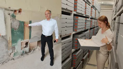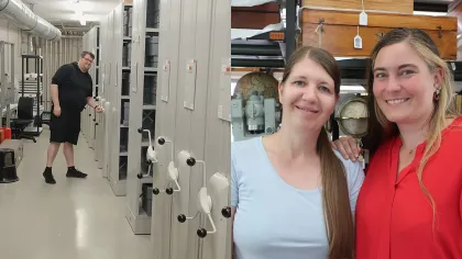 ....Sammlungsleiter Sebastian Fischer (r.) nach dem letzten noch freien Platz in der Rollregalanlage und die beiden Museumspädagoginnen Franziska Skanda (l.) und Alexandra Seefeld nach ihrem Aufgabenbereich nach der Wiedereröffnung des D.O.M.