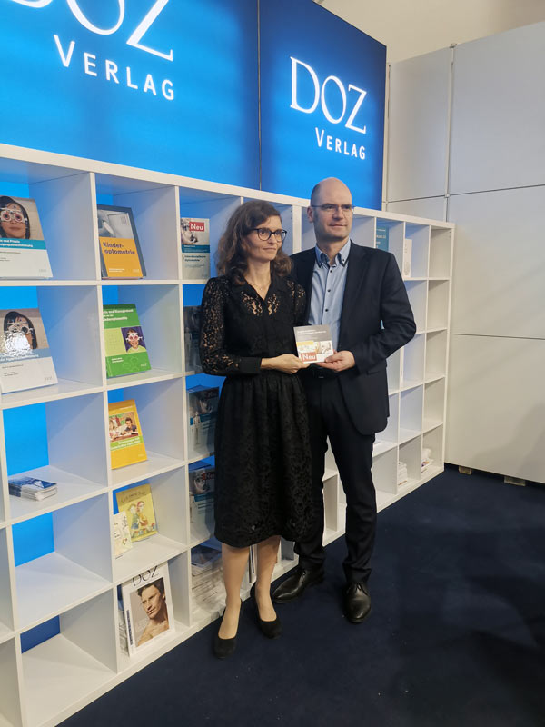 Am DOZ-Stand (C4/503) präsentierten die Autoren Dr. Michaela Friedrich und Professor Dr. Stephan Degle ihre neuen Fachbücher. Dr. Friedrich überarbeite den DOZ-Bestseller „Interdisziplinäre Optometrie“. Die Blaue Bibel, die „Refraktionsbestimmung“ von Heinz Diepes, wird von Professor Degle abgelöst uns soll voraussichtlich im ersten Quartal 2020 erscheinen. Einen ersten Vorabdruck können Besucher vorab einsehen. Die gemeinschaftlich von Dr. Friedrich und Professor Degle erarbeitete Kundenbroschüre „Entspannt am Bildschirm“ für Augenoptiker konnten am DOZ-Stand erworben werden.