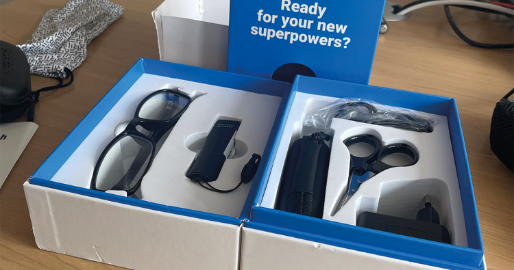Superkräfte im Karton: So sieht das OrCam-Set aus, das jeder Kunde beim Kauf der Kamera erhält. Ob er bereit ist für die „superpowers“, muss er dann selbst entscheiden …