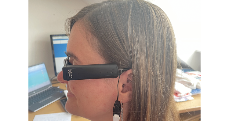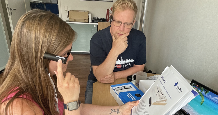 Augen zu und los. Marc Haas erklärt Autorin Lisa Meinl die Bedienung der OrCam.