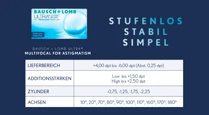 Die Bausch + Lomb ULTRA® Multifocal for Astigmatism gibt es in über 3.200 Parametern, standardmäßig im Lager! Diese Parametererweiterung ermöglicht Ihnen, die Bedürfnisse von einer großen Kundengruppe noch besser zu bedienen.