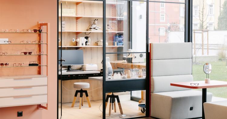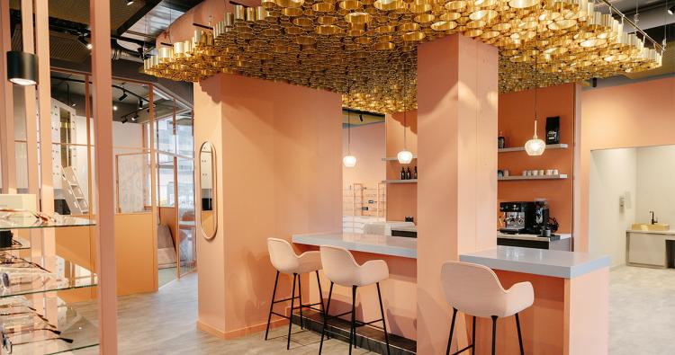 Modern und einladend in warmem Apricot-Ton: In der Die.Optrie soll der Mensch (wieder) im Fokus stehen - auch an der Bar beim gemütlichen Kaffee.