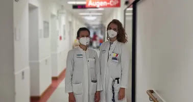 Die Optometristinnen Veronika Knöferle (links) und Melanie Grundel warten in der Augenklinik der TU München auf die nächsten Patienten.