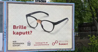 Brille kaputt? Mit großen Plakaten werben Pech und ihr Team für den Brillenreparatur- Service in ihrem Laden. Anstoß für den stärkeren Fokus auf dieses Angebot war die Erstellung der Gemeinwohl-Bilanz.