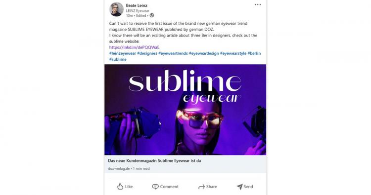 Einblicke in den Designprozess, ein Art-Shooting und zahlreiche Geschichten rund um die Eyewear: Aus der Leidenschaft für die Brille als Modeaccessoire und Designobjekt schöpft das Special-Interest-Magazin Sublime Eyewear des DOZ-Verlags, das zum Frühjahr/Sommer sowie Herbst/Winter erscheint, sein Themenspektrum. "Denn nur wer mit den Menschen spricht, die Brillen entwickeln, gestalten und herstellen, spürt die Geschichten jenseits der Produkte auf", davon ist Sublime Eyewear-Chefredakteurin Angela Mrositzki überzeugt. Dass das Magazin, welches sich an Verbraucherinnen und Verbraucher sowie an Augenoptikerinnen und Augenoptiker zur Kundenbindung richtet, den Zeitgeist trifft, zeigen die vielen positiven Reaktionen, die die Redaktion in den letzten Wochen erreicht haben. An dieser Stelle noch einmal: Vielen Dank! Und um auch Sie zu überzeugen, hier ein paar Stimmen der Leserinnen und Leser: