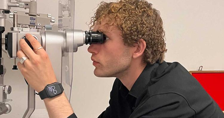 Samuel Burkart führt eine Spaltlampenuntersuchung an einer Kundin in dem internen Optometry Clinic Programm durch.
