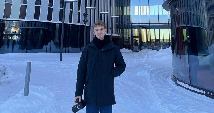 Der Student der Hochschule Aalen steht vor dem Eingang des modernen Myllypurro Campus der Universität.