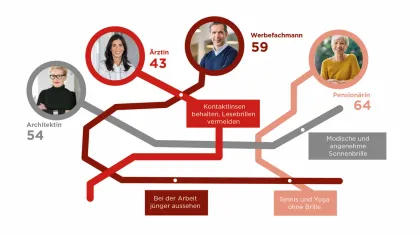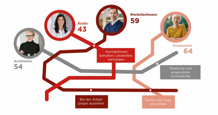 Abb. 2: Eine erfolgreiche Reise erfordert ein Ziel (eine gemeinsame Definition des Erfolgs), ein Transportmittel (Design, Material und Modalität der Linsen) und eine Route (zum Beispiel Linsen plus Brille). Außerdem müssen wir unterwegs mögliche Hindernisse oder sich ändernde Bedürfnisse berücksichtigen. Der Routenplaner zeigt verschiedene Wege, um die unterschiedlichen Bedürfnisse presbyoper Kunden zu erfüllen.