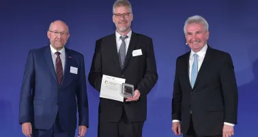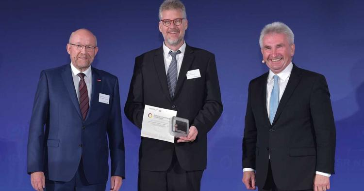 Im Oktober 2021 nahm der Dortmunder Augenoptikermeister Nils Berndt (Mitte) den Innovationpreis des Landes NRW aus den Händen von Berthold Schröder (l.), Vizepräsident des Westdeutschen Handwerkskammertages, und Andreas Pinkwart, Minister für Wirtschaft, Innovation, Digitalisierung und Energie, entgegen.
