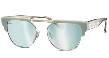 Das feminine Clubmaster-Modell 747020 col. 42 – eine Kombination aus Acetat und Edelstahl – mit hoch angesetzter Brücke, markanter Oberlinie und weiten Backen. Die Front ist in einem Salbei-Ton in Verbindung mit einem silbern glänzendem Metall gehalten. Die kristallfarbigen Azetatbügel bringen das Mini-Muster an der Bügeleinlage zur Geltung. Auf den silbern verspiegelten Sonnengläsern aus Nylon kann man am linken Glas das gelaserte Mini Wing-Logo erkennen, welches sich ebenfalls an den runden Bügelenden wiederfindet.
