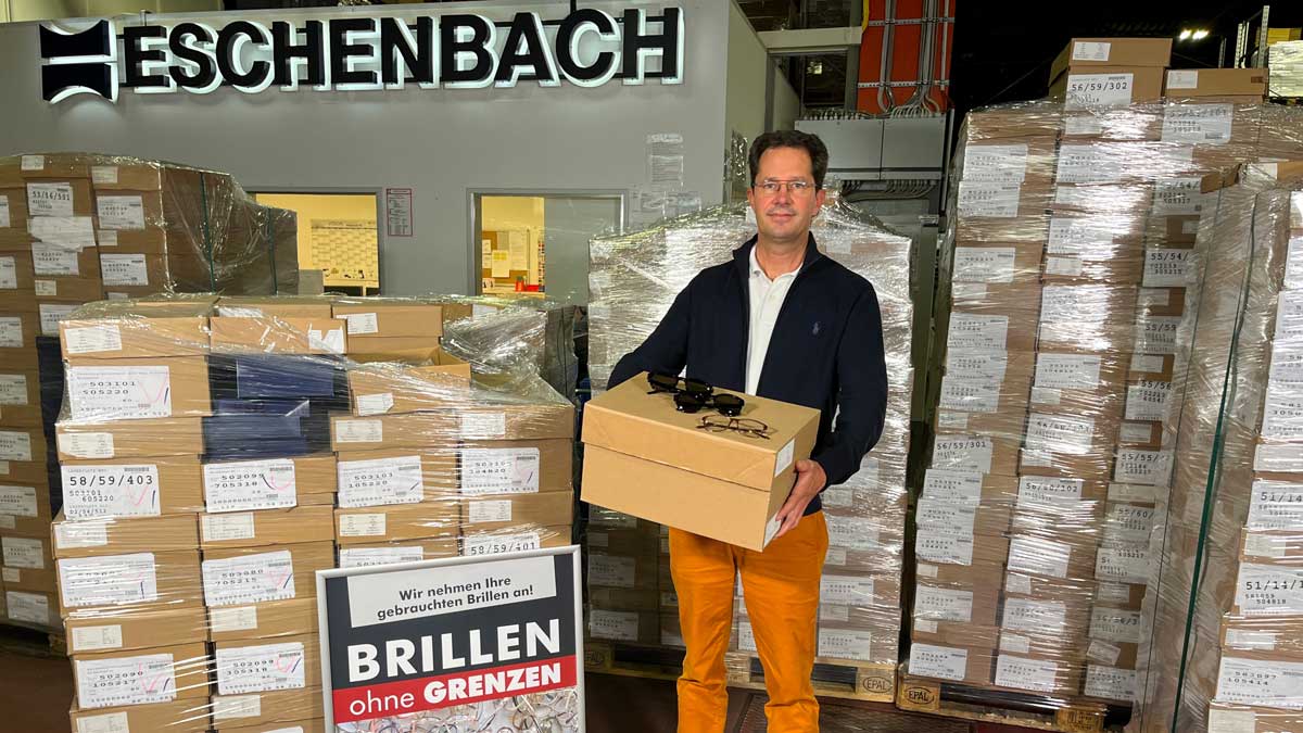 Eschenbach CEO Dr. Jörg Zobel mit den rund 24.000 Fassungen für die Hilfsorganisation Brillen-ohne-Grenzen.