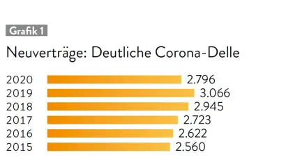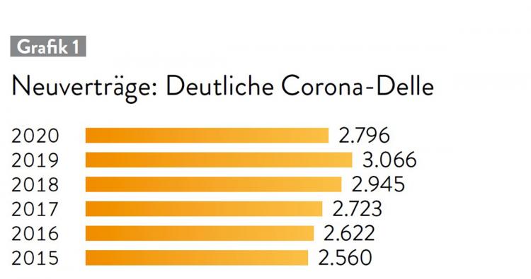 Hatte die Zahl der Neuverträge 2019 noch die 3.000er-Schwelle überschritten, sank sie im Corona-Jahr 2020 wieder fast auf den Stand von 2017. Auch vergangenes Jahr konnte der Rückgang der Neuverträge nicht aufgeholt werden.