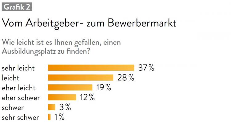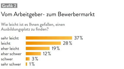 In einer separaten Online-Befragung unter Auszubildenden zeigt sich, dass die Ausbildungsplatzsuche für die Bewerber in der Regel problemlos verläuft. Umgekehrt heißt das jedoch, dass Ausbildungsbetriebe nunmehr um die besten Bewerber konkurrieren müssen.
