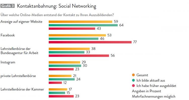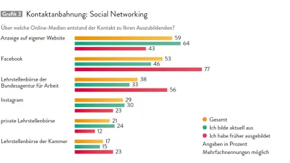 Auf den ersten Blick scheint Online-Medien keine relevante Bedeutung bei der Besetzung von Ausbildungsplätzen zuzukommen. Nur neun Prozent der befragten Betriebe gab an, dass der Kontakt zur Auszubildenden über diesen Weg erfolgte. Allerdings täuschen diese Zahlen mittlerweile oft. Denn vor der eigentlichen Kontaktaufnahme steht für viele Ausbildungsplatzsuchende die Onlinerecherche. Hinterlässt diese einen eher negativen Eindruck, dürfte beispielsweise eine anschließende Initiativbewerbung zumindest weniger wahrscheinlich werden.