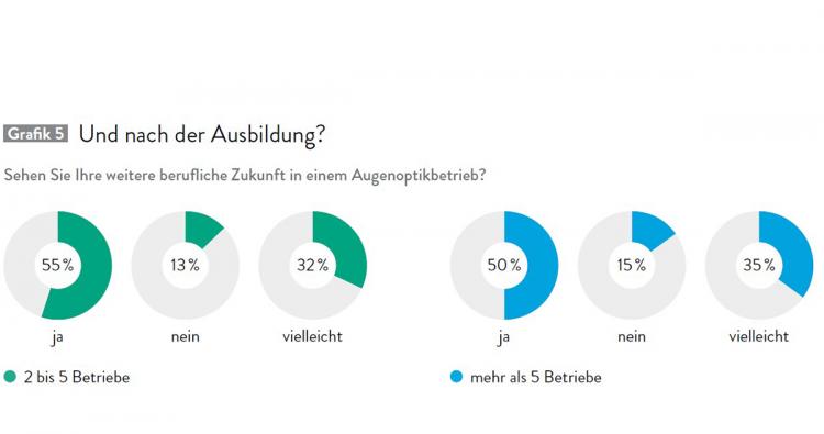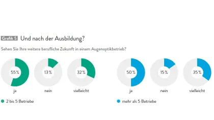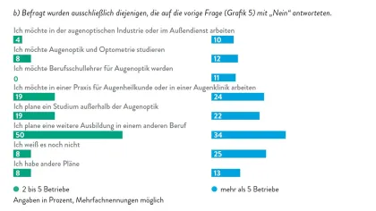 Gleichsam spannend sind aber auch die Zukunftswünsche derjenigen Auszubildenden, die ihre berufliche Zukunft nicht in einem augenoptischen Betrieb sehen. Fast 70 Prozent dieser Auszubildenden in Unternehmen mit zwei bis fünf Filialen plant im Anschluss an die Ausbildung entweder ein fachfremdes Studium oder eine weitere Ausbildung in einem anderen Beruf. Bei Filialisten ist dieser Wert deutlich geringer. Deutlich höher sind demgegenüber die Werte der Unentschlossenen und derjenigen, die vom Lernenden zum Lehrenden an einer Berufsschule werden wollen.