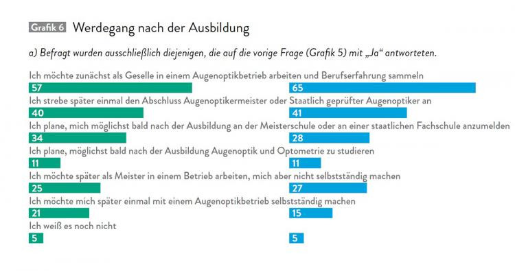 Um dem Fachkräftemangel Herr zu werden, ist es entscheidend, dass eine größtmögliche Zahl des augenoptischen Nachwuchses nach der Ausbildung auch im Betrieb, wenigstens in einem Augenoptikbetrieb seine Zukunft sieht. Und an dieser Stelle gibt es noch gehörig Potenzial. Denn nur jeder Zweite Auszubildende will auch langfristig im Laden sowie in der Werkstatt stehen (siehe Grafik 5). Auch hier zeigen sich signifikante Unterschiede zwischen Vertriebsformen (siehe Grafiken 6a und 6b). Deutlich mehr Auszubildende streben in den Unternehmen mit zwei bis fünf Filialen danach, sich bald nach der Ausbildung an der Meisterschule oder an einer staatlichen Fachschule anzumelden. Auch der Wille, sich zukünftig selbständig zu machen ist hier größer ausgeprägt. Auszubildende bei Filialisten wollen im Gegenzug häufiger zunächst als Gesellinnen und Gesellen Berufserfahrung sammeln.