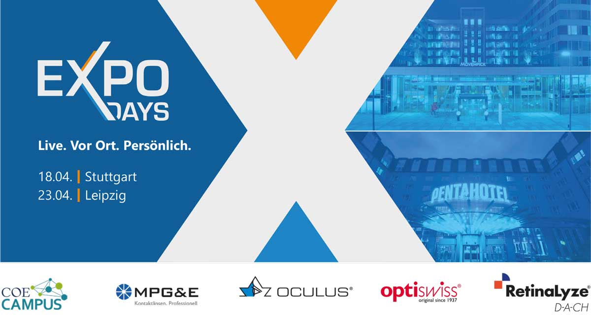 Gemeinsam mit den Partnern Optiswiss, MPG&E, DOZ/COE Campus und RetinaLyze kommt Oculus im Rahmen der Expo Days im April nach Stuttgart und Leipzig. Vorträge der Partner, neueste Technologien und eine vielseitige Ausstellung stehen auf dem Programm. Die Experten-Teams beantworten offene Fragen und geben wertvolle Anwendungstipps für die Praxis.