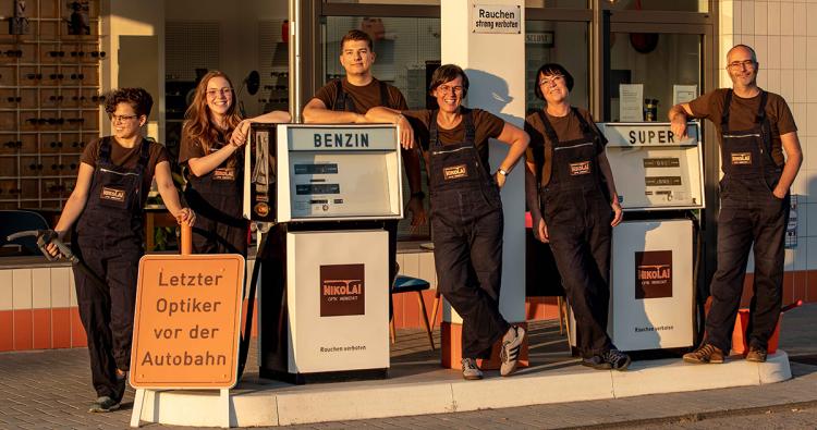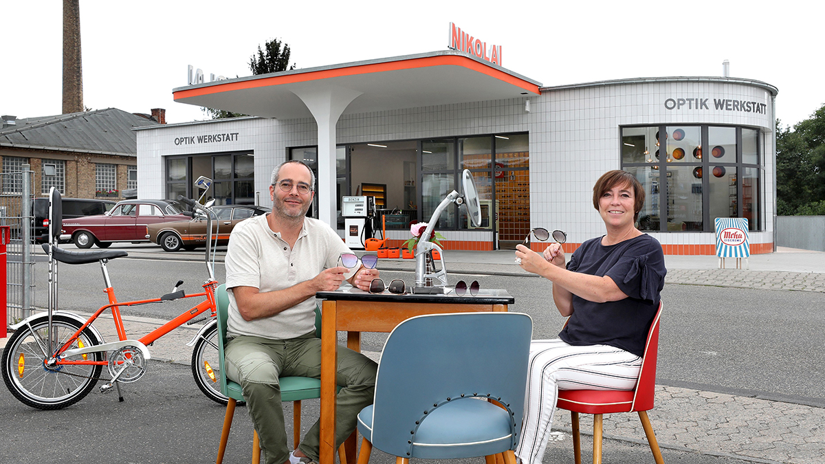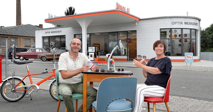 Eine Antwort trauen sich die beiden aktuell schon weit vor Ablauf dieser Zeitspanne zu. Mit dem – zumindest konzeptionellen – Sprung zurück in die Vergangenheit haben sie sich fit für die Zukunft gemacht, davon sind die Klippels überzeugt. Denn einmal ganz davon abgesehen, dass die Reste des ehemaligen Ärztehauses inzwischen komplett zum „Co-Working-Space“ umgewandelt wurden, lagen die Geschäftsinhaber mit dem Umzug und der Neuausrichtung auch sonst richtig. Der Großteil der früheren Klientel sei ihnen treu geblieben, etliche neue Kundinnen hinzugekommen, „davon vermutlich die meisten aufgrund des neuen Konzepts, weil sie irgendwo von unserer Tankstelle gehört oder gelesen haben.“ Bei den Neukunden handelt es sich weniger um Lauf-, als vielmehr um Fahrkundschaft. Aus Würzburg und Norddeutschland schauten schon Oldtimer-Fans vorbei, sogar der seltene Jensen Interceptor, nur knapp 7.000 Mal gebaut, wurde bereits an der Optik-Werkstatt gesichtet. „Man darf auch gerne bei uns nur einen Zwischenstopp auf dem Ausflug machen, in der Wohnzimmerecke einen Kaffee oder eine Sinalco trinken und weiterfahren“, betont Klippel. So manch einer kaufe dann aber doch eine schicke Vintage- oder Sonnenbrille von Jaguar, Carrera oder Playboy. Wirtschaftlich scheint sich das zu rentieren, denn inzwischen ernährt die Optik-Werkstatt sieben Mitarbeitende.