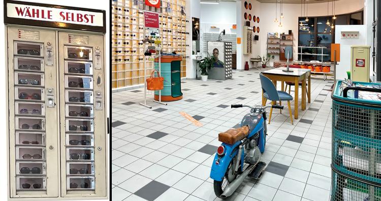 Ein Unikat, natürlich, im Katalog für Ladeneinrichtung bestellen kann man diesen Trumm von mehreren hundert Kilogramm Gewicht nicht, man muss ihn aufstöbern, im besten Fall von privat über Ebay-Kleinanzeigen, so wie Augenoptikermeister Klippel auch den alten Warenautomaten mit Geldeinwurf, 20 Klappfächern und der Aufschrift „Wähle selbst“ auf diesem Onlinemarktplatz aufgestöbert, erbeutet und „in mühevoller Kleinarbeit im möglichst originalgetreuen Look restauriert“ hat. Soll heißen, dass er die Front mit Stahlwolle bearbeitet, die Fächer erst mit Schmirgelpapier vom Alufraß befreit und dann auf dem Polierbock poliert sowie neue Glasscheiben eingesetzt hat. Stilecht hat Klippel zuletzt den Korpus so gestrichen, dass die abgeschabte Fläche unter dem Geldeinwurf erhalten blieb – Vintage eben.