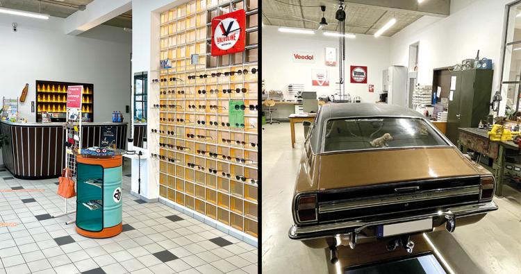 Jedes Detail ist durchdacht: Von der Ladentheke mit Sinalco-Bar (links) bis hin zu den Werkstatt- Arbeitsplätzen rund um den Ford Taunus passt die Einrichtung zusammen.