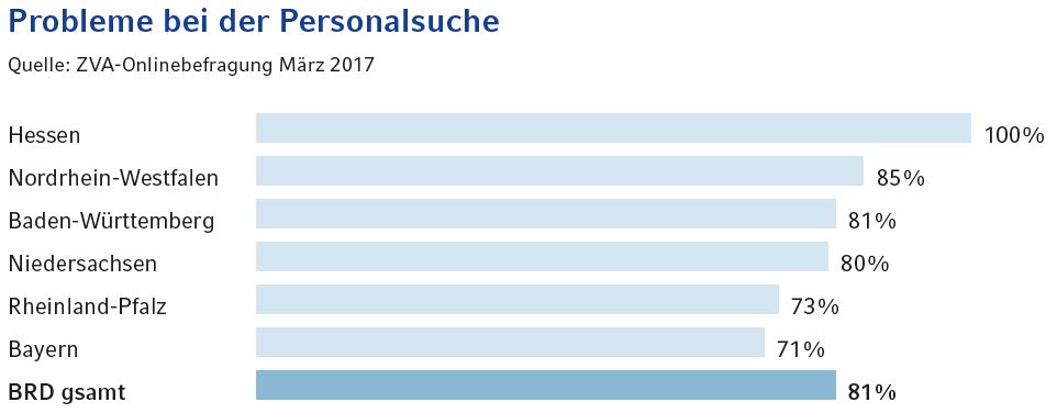 Unternehmen finden immer schwerer Fachkräfte. Dabei gibt es aber große regionale Unterschiede (siehe Grafik 1: Es sind nur die Bundesländer aufgeführt, bei denen mehr als zehn Betriebe auf die Online-Umfrage geantwortet haben). In Hessen haben alle Betriebe, die Personal einstellen wollen, Probleme geeignetes Personal zu finden. In Rheinland-Pfalz und Bayern ist zwar das Problem unterdurchschnittlich ausgeprägt, allerdings haben immer noch mehr als 70 Prozent Probleme bei der Personalsuche. Nach den Forschern des Instituts der deutschen Wirtschaft Köln (IW) ist branchenübergreifend keine Verbesserung in Sicht. In Westdeutschland geht voraussichtlich jeder dritte Arbeitnehmer in den kommenden 15 Jahren in Rente. In Ostdeutschland sind es in manchen Regionen sogar bis zu 42 Prozent. Im Osten wird sich die Lage wahrscheinlich noch schneller zuspitzen, denn dort können die Unternehmen auch überdurchschnittlich viele Ausbildungsplätze nicht besetzen. In einigen Regionen blieben 2016 bis zu 25 Prozent aller Lehrstellen unbesetzt.