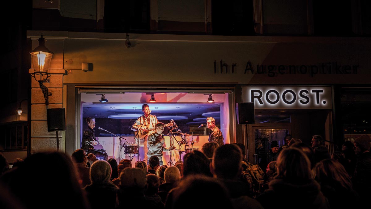 Pascal Schwyn (vor dem Schaufenster) eröffnet das Konzert der Baba Shrimps.