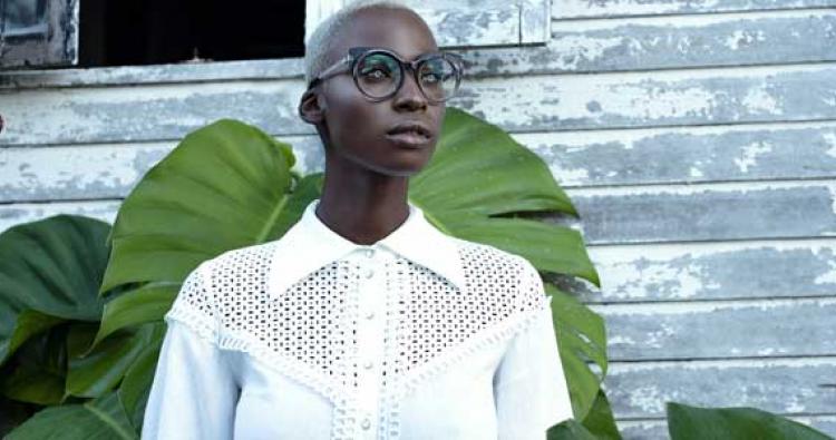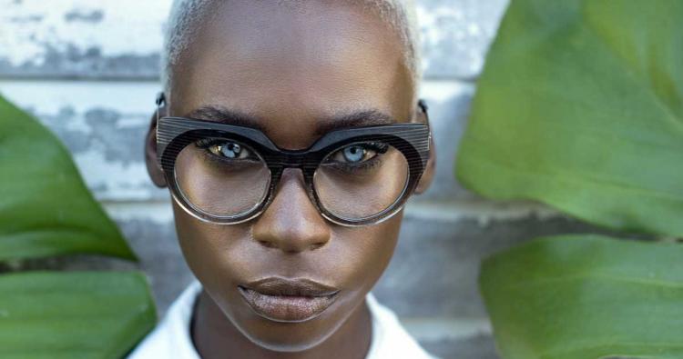 Model Jalicia Naightingale mit den stechenden blauen Augen präsentiert die Korrektionsfassung PFB-16 von Peoples from Barbados.