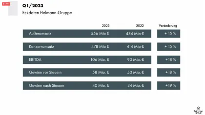 "Das Konsumklima liegt 2023 weiterhin auf historisch niedrigem Niveau. In Krisenzeiten kaufen Kunden dort, wo sie garantierte Qualität zu günstigen Preisen erhalten. In der Augenoptik und Hörakustik ist das die Fielmann-Gruppe", so das Unternehmen. Fielmann gibt an, auf Marktanteilsgewinnen aus dem Vorjahr weiter aufgebaut zu haben, der Umsatz und Gewinn seien im zweistelligen Bereich gewachsen. Das zeigte sich am Außenumsatz des ersten Quartals 2023, in dem Fielmanns Außenumsatz (inklusive Mehrwertsteuer und Bestandsveränderungen) gegenüber des Vorjahres um 15 Prozent auf 556 Millionen Euro gesteigert werden konnte (zum Vergleich zu Q1 2022: 484 Millionen Euro).