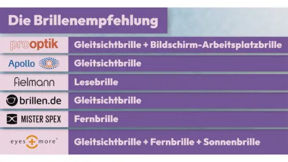 Wer empfiehlt welches Glas? Bei dieser Frage gab es bei den Filialisten zum Teil starke Abweichungen. Insgesamt sind es fünf verschiedene Empfehlungen. Fielmann bietet eine reine Lesebrille an, da für die Ferne noch kein Korrekturbedarf bestünde. Pro Optik hingegen empfiehlt eine Gleitsichtbrille in Kombination mit einer Nahkomfortbrille, da Svenja viel am Computer arbeitet. Apollo und Brillen.de hingegen raten zu einer Gleitsichtbrille, Mister Spex zu einer reinen Fernbrille. Bei Eyes and more bekommt die Kundin eine Gleitsicht-, eine Fern- und eine Sonnenbrille, wobei die Sonnenbrille ausschließlich Fernstärken hat.