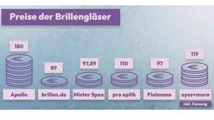 Beim Preisvergleich schickt das Sat.1-Team eine weitere Testkundin mit einer Fremdfassung in die Filialen, um sich diese verglasen zu lassen. Die Anforderungen der 21-Jährigen an die Gläser: Sie sollen leicht und dünn sein, härtebeschichtet, superentspiegelt und über den Lotuseffekt verfügen. Bei Apollo werden die verschiedenen Möglichkeiten am Glasposter aufgezeigt. Letztlich kommen so 180 Euro für die Gläser zusammen, inklusive 30 Euro Einarbeitungsgebühr aufgrund der Fremdfassung. Bei brillen.de sind es 89 Euro, Mister Spex kommt aufgrund eines aktuellen Angebots und 40 Prozent Preisnachlass für Gläser und Beschichtungen auf 97,89 Euro (inklusive 49,95 Euro Einarbeitungsgebühr), bei Pro Optik werden 110 Euro aufgerufen und bei Fielmann 97 Euro. Einzig bei Eyes and more wird eine Fremdverglasung nicht angeboten, dafür aber das Angebot von 119 Euro für eine neue Fassung inklusive der gewünschten Gläser gemacht.