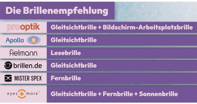 - Fielmann und Pro Optik: Die Brillen bei Fielmann (Lesebrille) und Pro Optik (Gleitsicht- und Bildschirmarbeitsplatzbrille) waren alle abgabefähig und ohne Beanstandung durch die Gutachter.