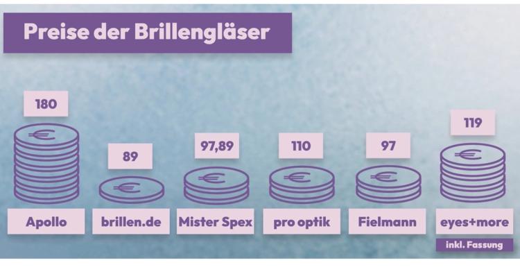 Beim Preisvergleich schickt das Sat.1-Team eine weitere Testkundin mit einer Fremdfassung in die Filialen, um sich diese verglasen zu lassen. Die Anforderungen der 21-Jährigen an die Gläser: Sie sollen leicht und dünn sein, härtebeschichtet, superentspiegelt und über den Lotuseffekt verfügen. Bei Apollo werden die verschiedenen Möglichkeiten am Glasposter aufgezeigt. Letztlich kommen so 180 Euro für die Gläser zusammen, inklusive 30 Euro Einarbeitungsgebühr aufgrund der Fremdfassung. Bei brillen.de sind es 89 Euro, Mister Spex kommt aufgrund eines aktuellen Angebots und 40 Prozent Preisnachlass für Gläser und Beschichtungen auf 97,89 Euro (inklusive 49,95 Euro Einarbeitungsgebühr), bei Pro Optik werden 110 Euro aufgerufen und bei Fielmann 97 Euro. Einzig bei Eyes and more wird eine Fremdverglasung nicht angeboten, dafür aber das Angebot von 119 Euro für eine neue Fassung inklusive der gewünschten Gläser gemacht.
