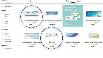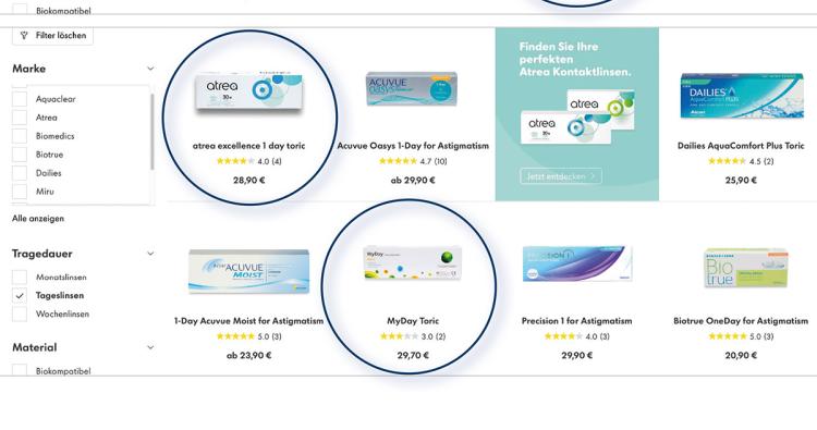 Vergleicht man auf der Fielmann-Homepage die Eigenmarke Atrea mit den Originalprodukten von CooperVison und Alcon, liegen die Verkaufspreise zumeist gar nicht so weit auseinander. Beispiele: Die MyDay toric von CooperVision kostet im 30er- Pack 29,70 Euro, die produktgleiche Eigenmarke Atrea Excellence 1 Day toric gibt es für 28,70 Euro; Alcons Dailies AquaComfort Plus multifocal wird für 29,90 Euro (30 Stück) angeboten, die Atrea Select 1 Day multifocal gibt es für 28,90 Euro (30). Legt man jetzt die Margen-Aussagen von Marc Fielmann über diese Preise, wird schnell ersichtlich, dass die Einkaufskonditionen für die Eigenmarken deutlich attraktiver sein müssen, die Differenz zwischen Selbstkosten und Verkaufspreis also deutlich größer. Und bei einem von Marc Fielmann ausgegebenen Ziel von 60 Prozent Eigenmarkenanteil bei Kontaktlinsen bis 2025 (aktuell sind es lediglich fünf Prozent), dürfte sich dieser Margenvorteil deutlich bemerkbar machen.