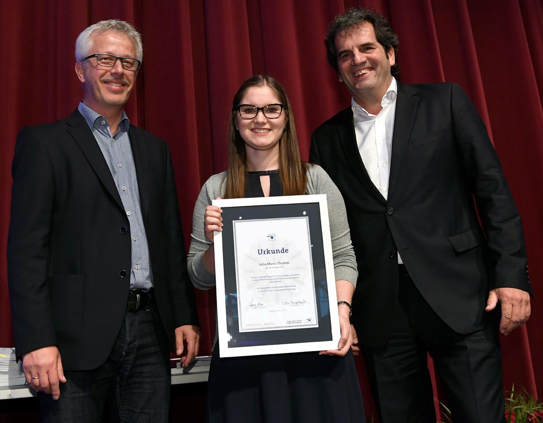 In der Berufsschule Leonberg überreichte Landesinnungsmeister Müller 107 Gesellenbriefe und Gesellenprüfungszeugnisse – der Vize-Geschäftsführer der Handwerkskammer Reutlingen, Rainer Neth, hatte die Absolventen zuvor begrüßt: Julia Maria Thumm (Mosbach) schloss die Gesellenprüfung in Baden-Württemberg mit dem besten Gesamtergebnis ab. Sie erhielt mit der Urkunde auch einen Geldpreis und den Azu-Blick-Preis der Firma Zeiss. Das zweitbeste Gesamtergebnis in Baden-Württemberg erzielte Marco Pinto (Stuttgart) und erhielt für seine Leistung ebenfalls eine Urkunde und einen Geldpreis.