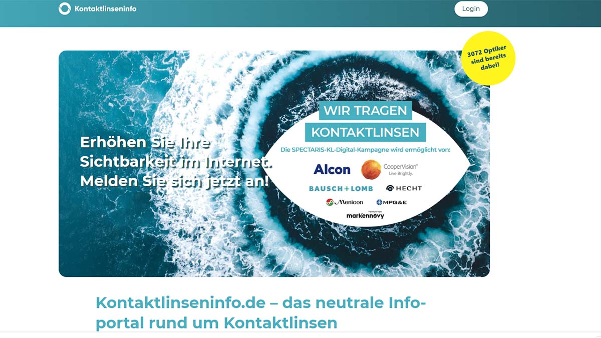 Von führenden Unternehmen der Branche entwickelt, startet auch 2022 die Digital- und Marketing-Kampagne rund um die Kontaktlinse. Das Kuratorium für Gutes Sehen (KGS) und viele Hersteller aus dem Spectaris-Kontaktlinsenkreis unterstützen die inzwischen an den 4000 Einträgen kratzende Aktion. Die dazugehörige Webseite www.kontaktlinseninfo.de ist SEO optimiert, 3072 Optikerbetrieben aus ganz Deutschland, Österreich und der Schweiz sind inzwischen bereits dabei. Der Eintrag auf der Webseite ist kostenlos. Das gemeinsame Ziel der Kampagne ist es, das Interesse für Kontaktlinsen zu erhöhen, neue Kontaktlinsenkundinnen zu gewinnen und zum stationären Fachhandel zu führen. Die Kampagne entstand 2019 und wird getragen von Alcon, Bausch und Lomb, CooperVision, Hecht, Menicon, MPG&E und mark'ennovy. Johnson & Johnson hat dieses Jahr mehrere eigene Kampagnen gestartet.